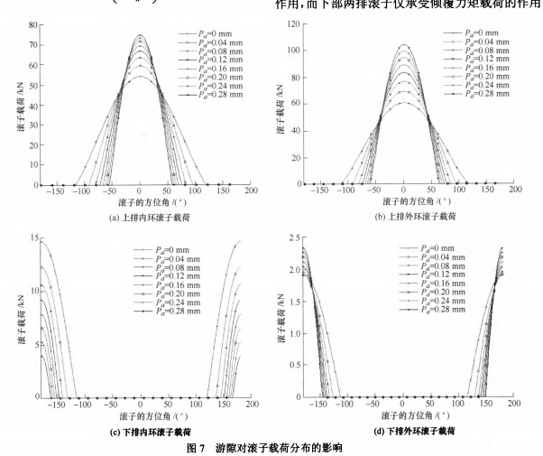 (2)轉(zhuǎn)盤軸承上部兩排滾子的載荷顯著大于下部兩排滾子的載荷,上排外環(huán)滾子的載荷大于上排內(nèi)環(huán)滾子的載荷,下排外環(huán)滾子的載荷大于下排內(nèi)環(huán)滾子的載荷。